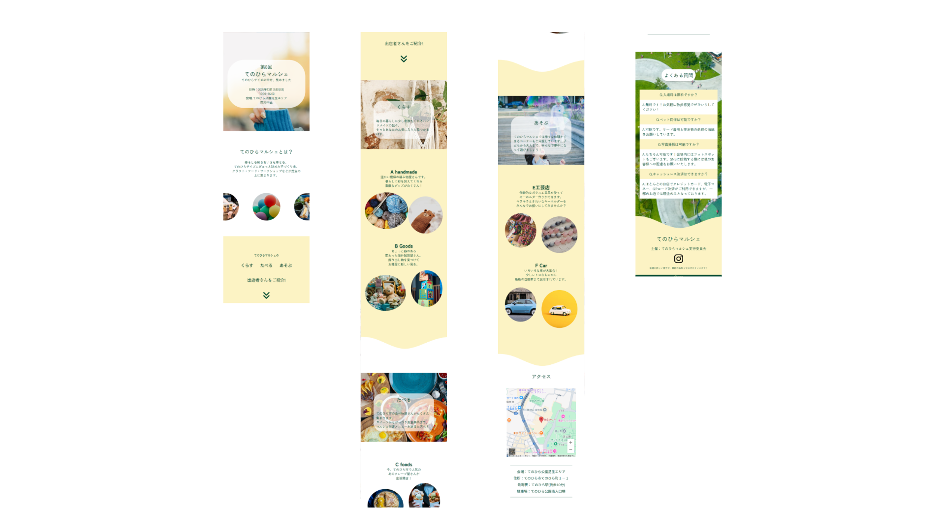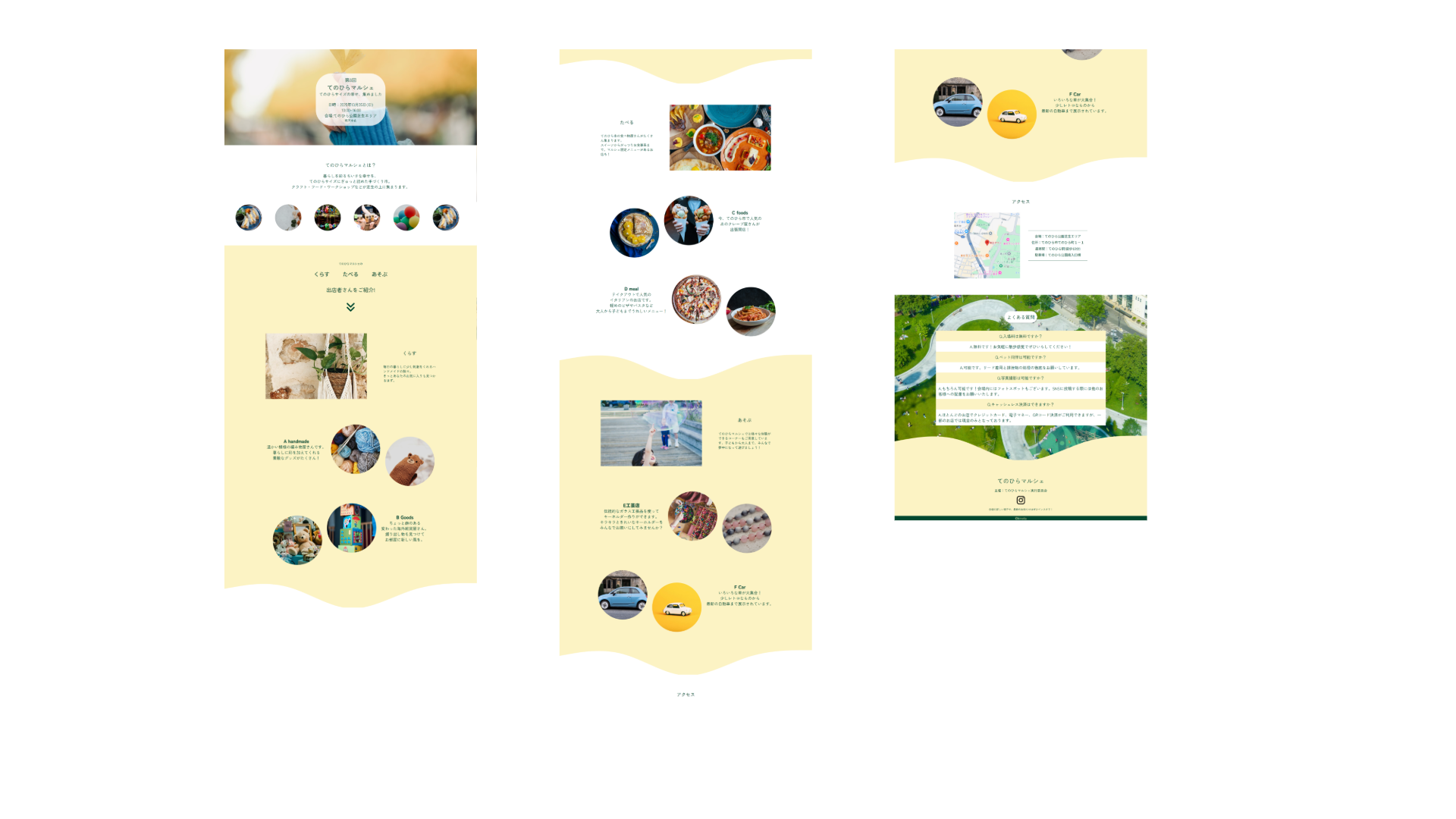 〇全体的に余白を多めにとり、写真でマルシェの雰囲気を感じ取ってもらい、視覚的に楽しめるようにしています。